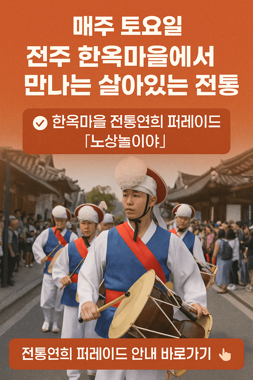 이 퍼레이드는 사전 예약 없이, 전 연령이 무료로 즐길 수 있으며, 공연 중 관객 참여형 프로그램이 구성되어 있어, 특히 가족 단위나 단체 관광객에게 큰 호응을 얻고 있습니다. 전주기접놀이, 풍물놀이, 마당놀이 등 다양한 전통연희가 한 시간 동안 펼쳐집니다.