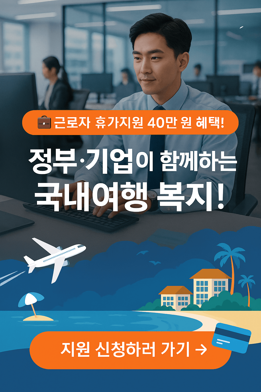 직원들이 휴가를 꿈꾸지만, 회사는 경비 문제로 지원을 망설이고, 직원들은 개인 비용으로 떠나기엔 부담이 큽니다. 결국 휴가는 반쪽짜리로 끝나버리는 현실. '복지 혜택은 대기업만 가능한 것인가?'라는 생각을 이제 바꿀 때입니다. 정부와 함께하는 이 제도가 그 해답이 될 수 있습니다.