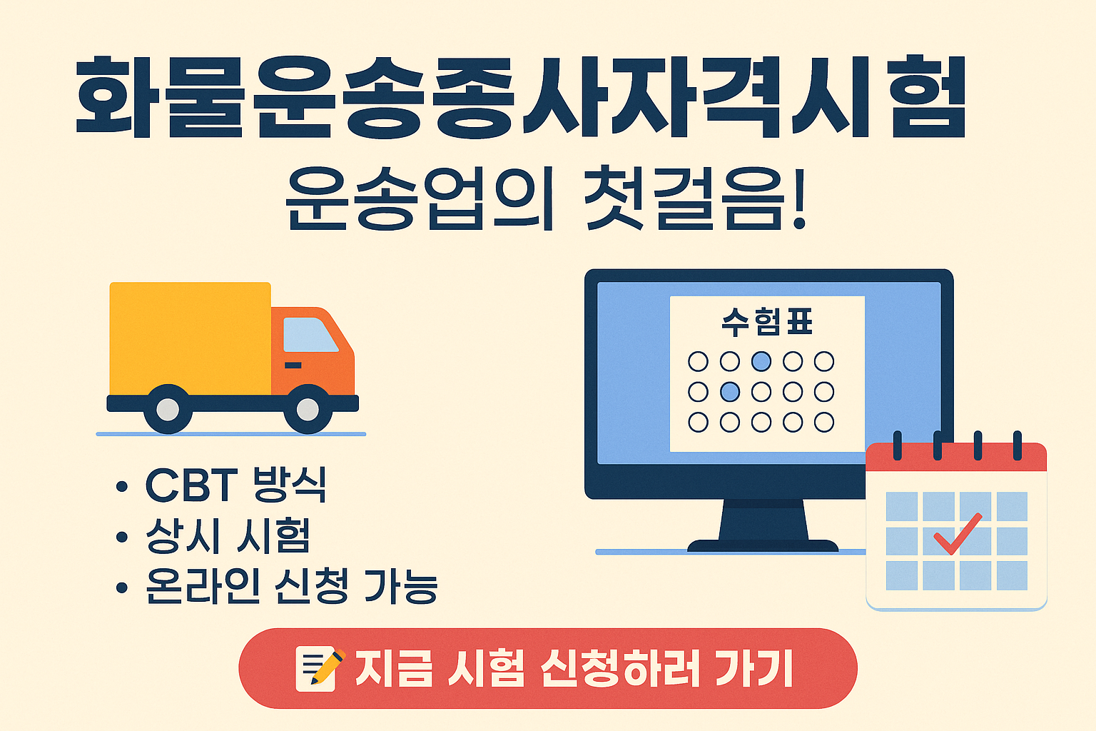 화물자동차 운전업무로 커리어를 시작하고 싶으신가요? 반드시 통과해야 할 국가자격시험, 『화물운송종사자격시험』이 그 첫 관문입니다. 한국교통안전공단(TS)에서 상시 시행하는 이 시험은 일정 선택이 유연하고, CBT(컴퓨터 기반 시험) 방식으로 빠른 결과 확인이 가능합니다. 지금 바로 준비를 시작해보세요!