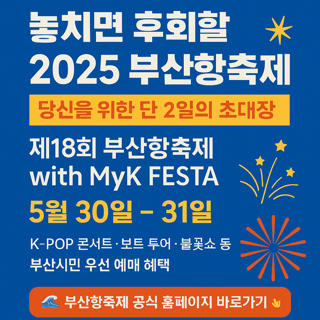 도심 한복판에서 바다와 음악, 불꽃이 어우러지는 특별한 축제를 찾고 계신가요? 2025년 5월 30일부터 31일까지 단 이틀간 열리는 ‘제18회 부산항축제 with MyK FESTA’는 단순한 지역행사가 아닙니다. 올해는 해양문화와 K-POP의 만남이라는 특별한 테마로, 가족은 물론 연인, 친구 누구와 와도 완벽한 주말을 선사합니다.